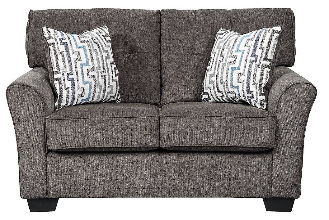 Chill out from the day in the soothing comfort of the Alsen granite loveseat. Kick back and relax with a loved one in the ultra-thick cushioning and soft earthy upholstery during movie night. With the blind tufted back, wedge arms, and short tapered feet, you’re free to laze about in chic style and peace of mind. Take it easy with the Alsen loveseat.