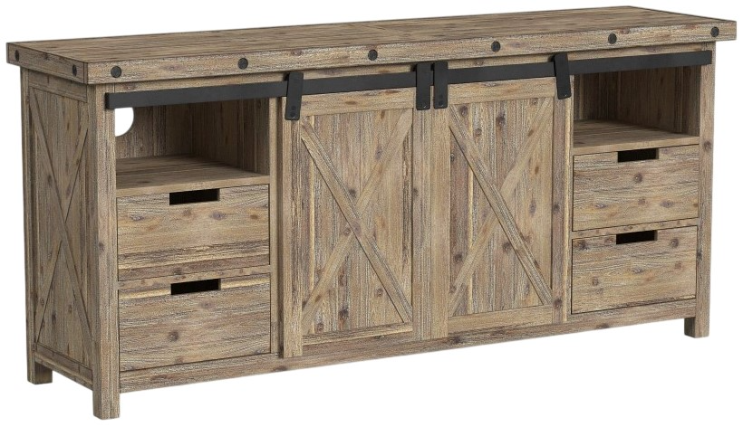 Industrial construction inspired by vintage workbench design. Drawing inspiration from vintage workbenches, the Carpenter entertainment base is constructed of solid wood planks, distressed for a reclaimed look, and hand-worked metal frames. Exposed bolt heads underscore the aged, oiled finish that resembles an industrial steel framework.Read More