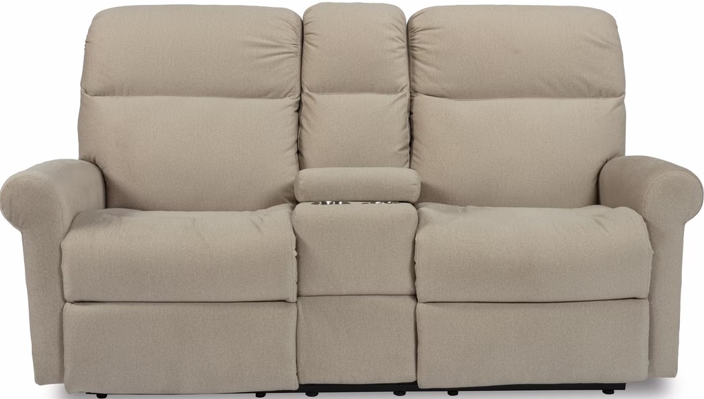 The center console includes two cup holders for drinks and a storage compartment to tuck away remotes and other belongings. A power reclining mechanism lets you change angles effortlessly from an upright to a fully reclined position.