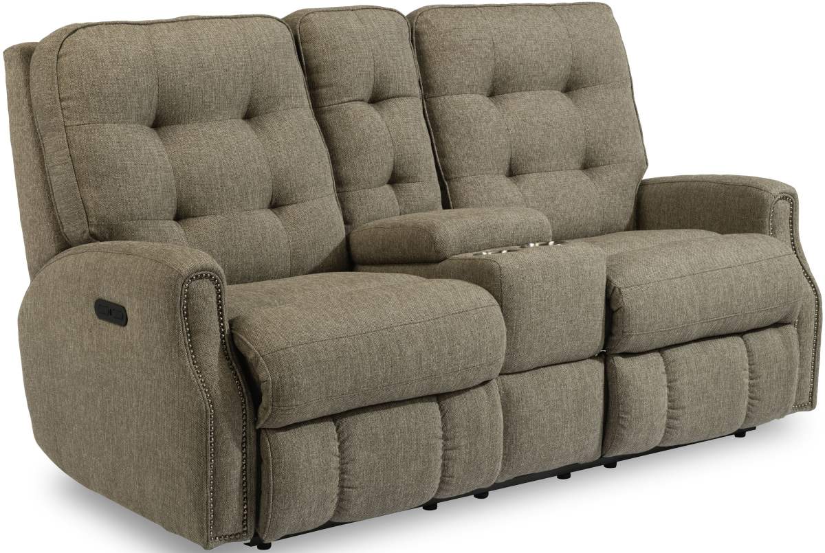 Indulge in the relaxing convenience of the fabric Devon power-headrest reclining loveseat with nailhead trim and a center console. Keep your refreshments at hand in the 2 cupholders, storage compartment, and storage drawer—do movie marathons right. With the powered recline and headrest features, you have endless opportunities to find your comfiest TV-watching position.