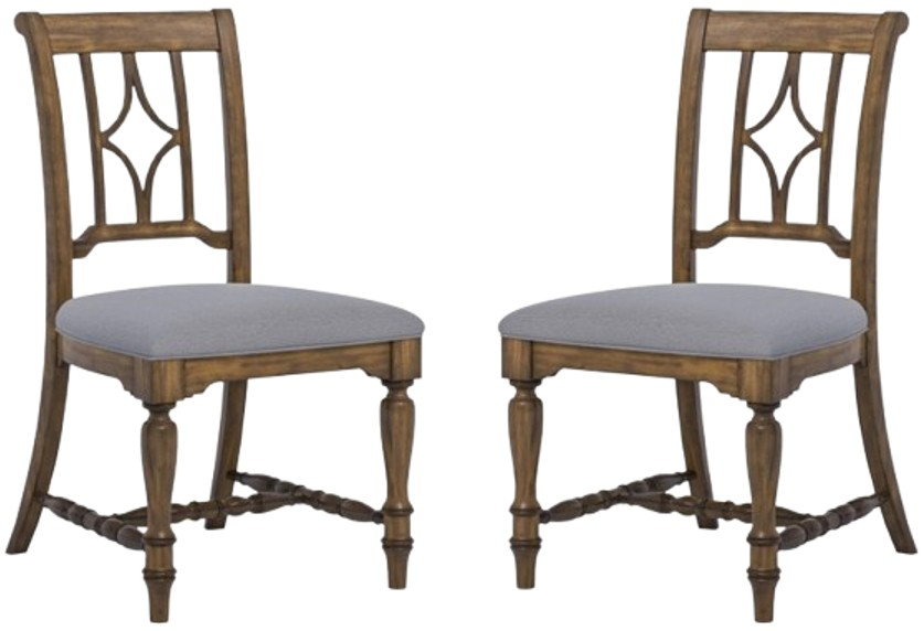 Designed to complement our Plymouth dining tables with a coordinating cottage look, this charming dining chair features an appealing open back design with a diamond-shaped detail, intricately carved trestles and turned legs for added vintage character. Each chair is upholstered in a durable and cleanable coordinating fabric, providing comfort for long periods of sitting.Read More