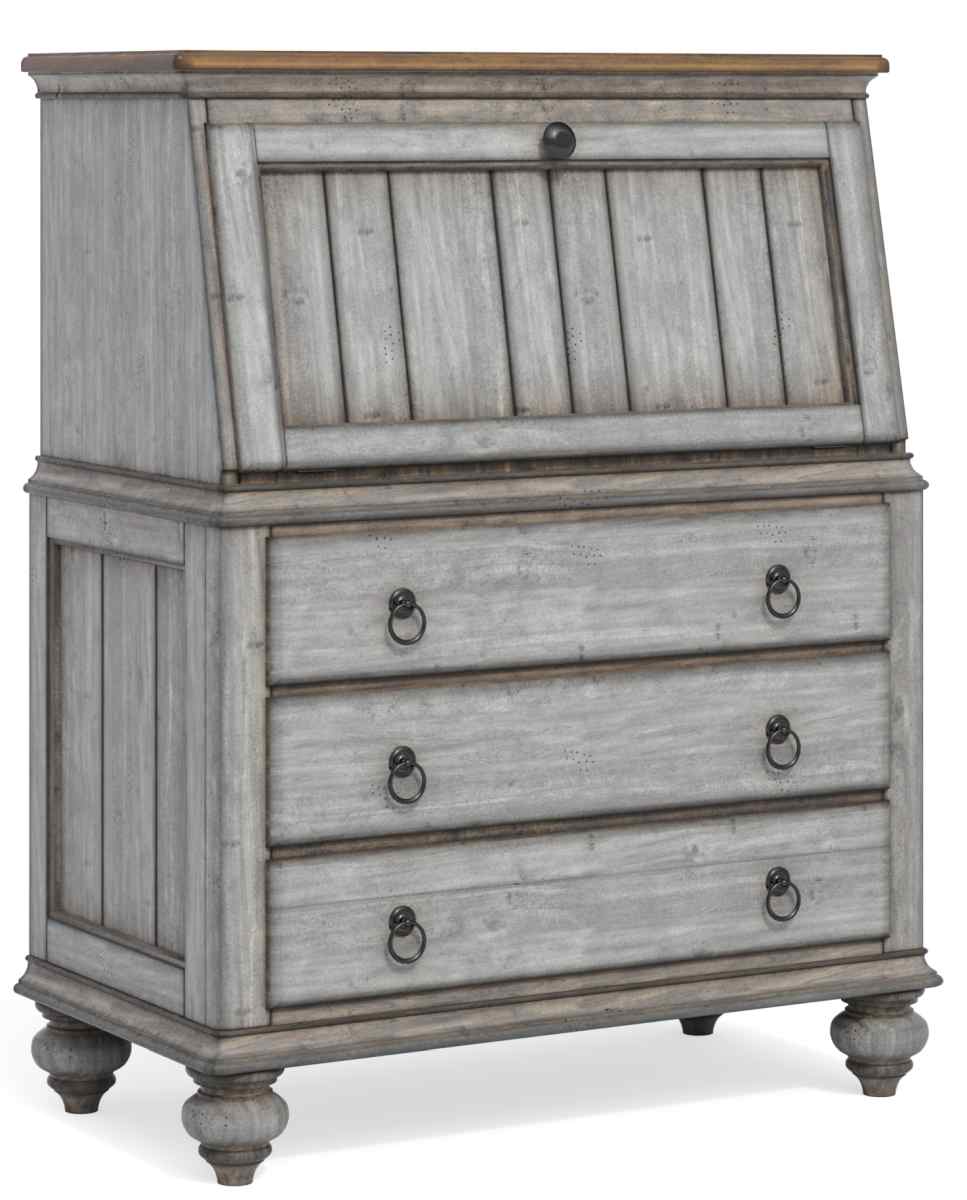 Shabby chic design with a bit of vintage. The Plymouth secretary cabinet boasts a shabby chic design with contrasting wood finishes and paneled construction. With an overall graywash finish accented by a dark top, Plymouth is ideal for those who like a bit of vintage design in their modern lives.Read More