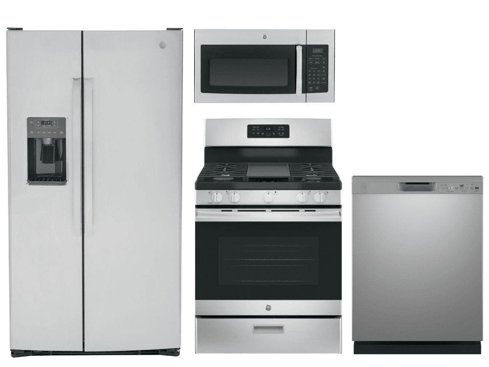 GE® 4 Piece Stainless Steel Kitchen Package with a side-by-side refrigerator, free standing electric range, built-in dishwasher and over the range microwaveRead More