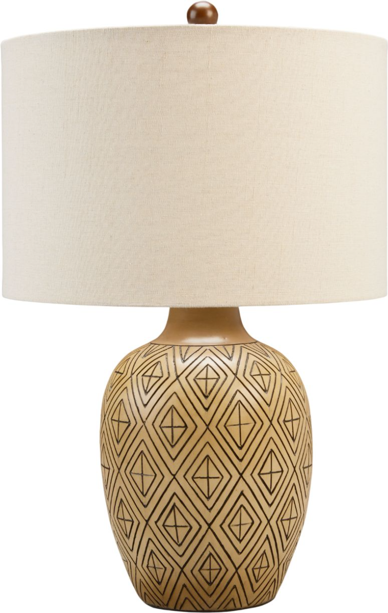 Light up your living space with this jar-shaped table lamp. Featuring a tan-hued polyresin body with a chic, inset design, it makes a welcoming accent to your tabletop decor. The modified drum fabric shade completes the crisp modern look, while a three-way switch offers options for setting the ambiance in the room.Read More