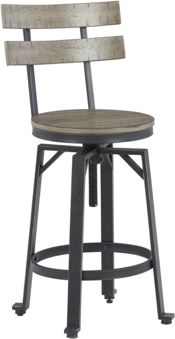 Delight in the effortless two-tone look of this swivel barstool. Dark iron-tone metal and distressed brown wood pair for a rustic look with modern sensibility. A ladderback design brings additional charm. The adjustable height, swivel motion and footrest allow you to find your ideal comfort position.Read More
